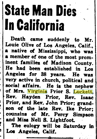 I dedicated my genealogy Tuesdays to researching Grandpa Booker’s relatives during the month of April. I was able to find his Aunt Virginia Luckett living in Jackson Mississippi in the 1940s and her children in newspapers. I also learned that they were members of the Pearl Street AME church in Jackson, Mississippi. My hope is by continuing to research Grandpa Booker’s Aunt, I will find out how she is his aunt and that will lead me to his parents.