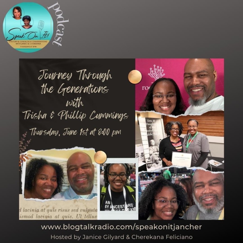 Phillip and I had the wonderful opportunity to be featured on the podcast, Speak On It – History and Genealogy Conversations with Janice Gilyard and Cherekana Feliciano. We talked about how and why we started our genealogy podcast, Journey Through the Generations. We also talked about some of our research. We had a great time sharing our story. Thank you so much Janice and Cherekana for this opportunity. We enjoyed it so much. Click HERE to listen to our interview on the Speak On It Podcast.