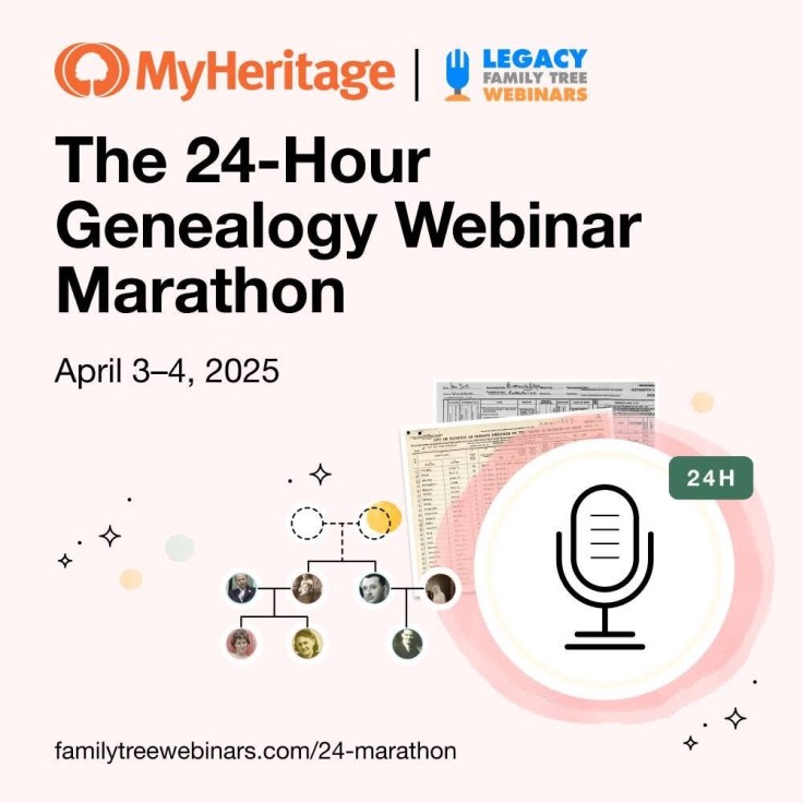The 6th Annual 24-Hour Genealogy Webinar Marathon, hosted by Legacy Family Tree Webinars and MyHeritage, is coming to a screen near you on April 3–4, 2025! The marathon kicks off on Thursday, April 3 at 5 P.M. Eastern (U.S.) and runs straight through to Friday, April 4 at 5 P.M. Eastern — that’s 24 hours of nonstop learning, inspiration, and discovery.