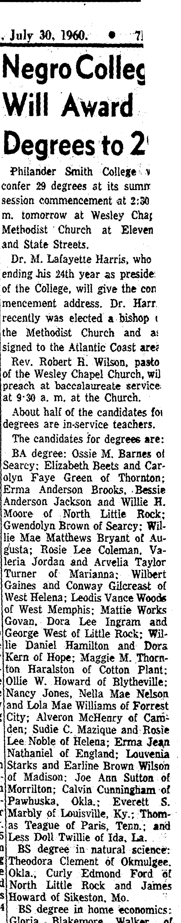 Philander Smith College 1960 graduates including my husband's grandmother, Mrs. Mattie Works Govan - Arkansas Gazette, July 30, 1960